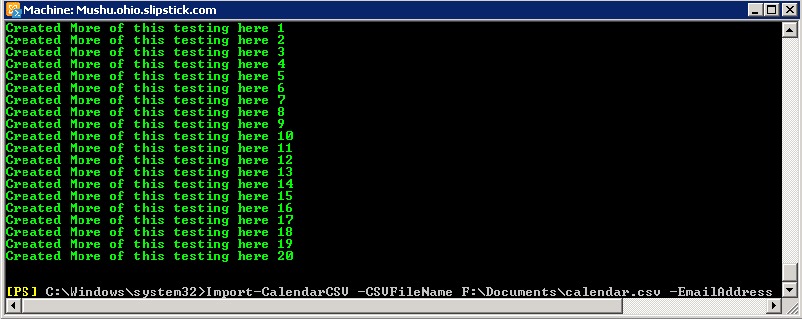 Import-CalendarCSV -CSVFileName F:\Documents\calendar.csv -EmailAddress alias@domain.com -username alias@domain.com -password thepassword