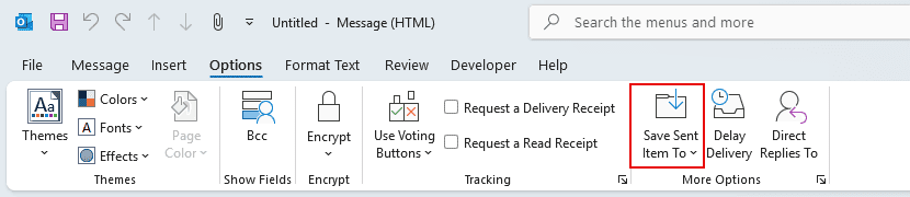 Note: The new Outlook for Windows app does not currently have an option to chose where to save sent messages.