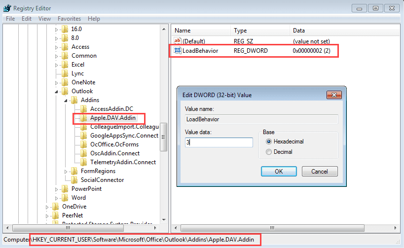 HKEY_CURRENT_USER\SOFTWARE\Microsoft\Office\Outlook\Addins\Apple.DAV.Addin